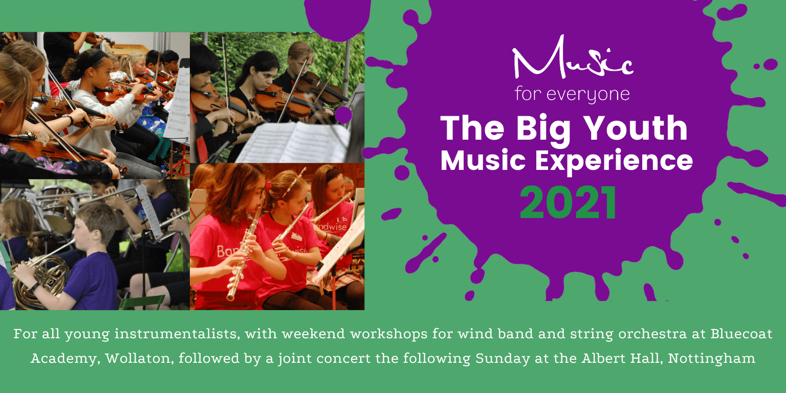 The Big Youth Music Experience is for all young instrumentalists, with a weekend split into a wind band workshop day and a string orchestra workshop day, followed by a joint concert the following Sunday at the Albert Hall, Nottingham!
