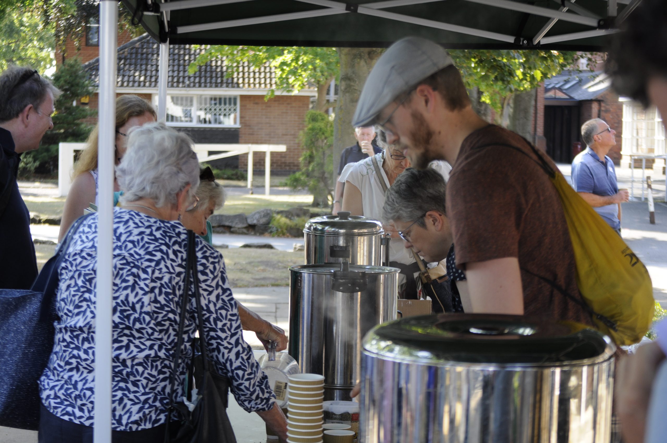Break time and it’s tea, coffee and biscuits outside in the sunshine, with a browse of the Bookwise stalls. With the help of our lovely volunteers and Chair of Trustees John Hess, teas and coffees were served, with John learning the secret to how many tea bags make a great pot of tea!