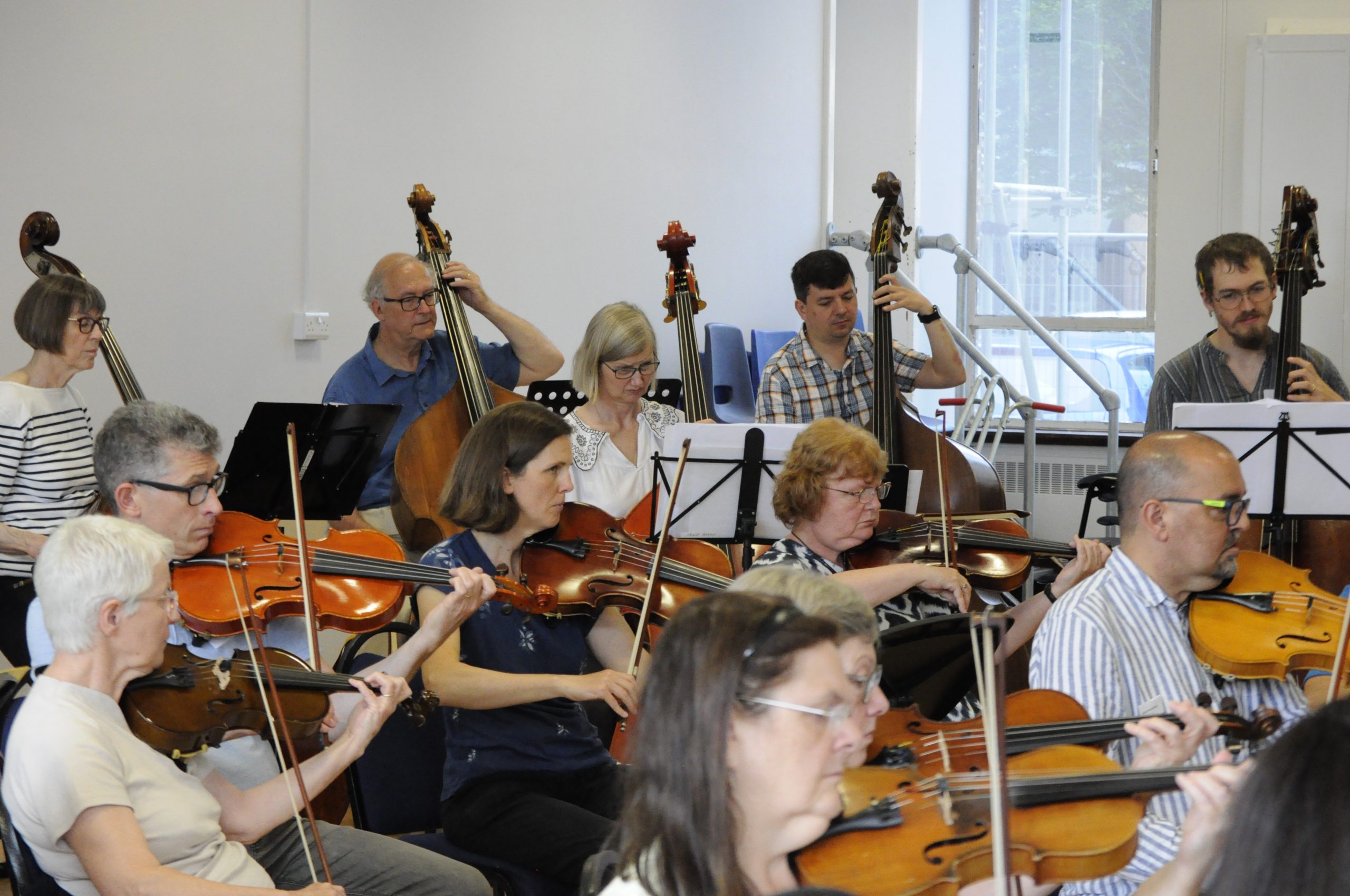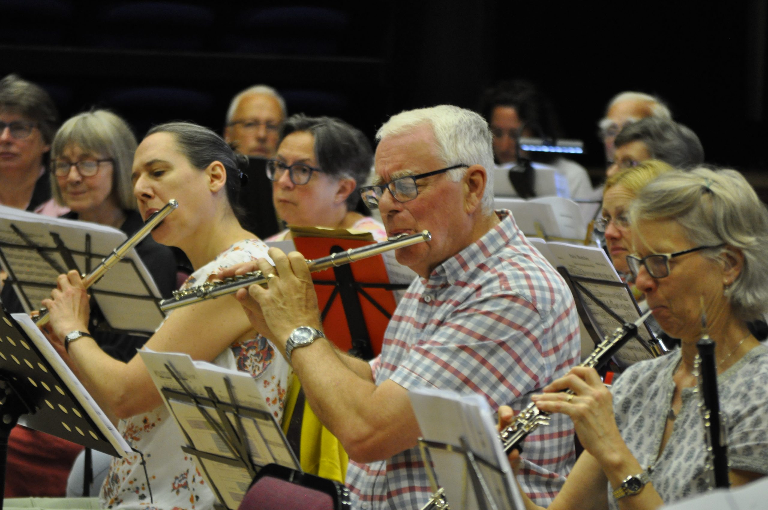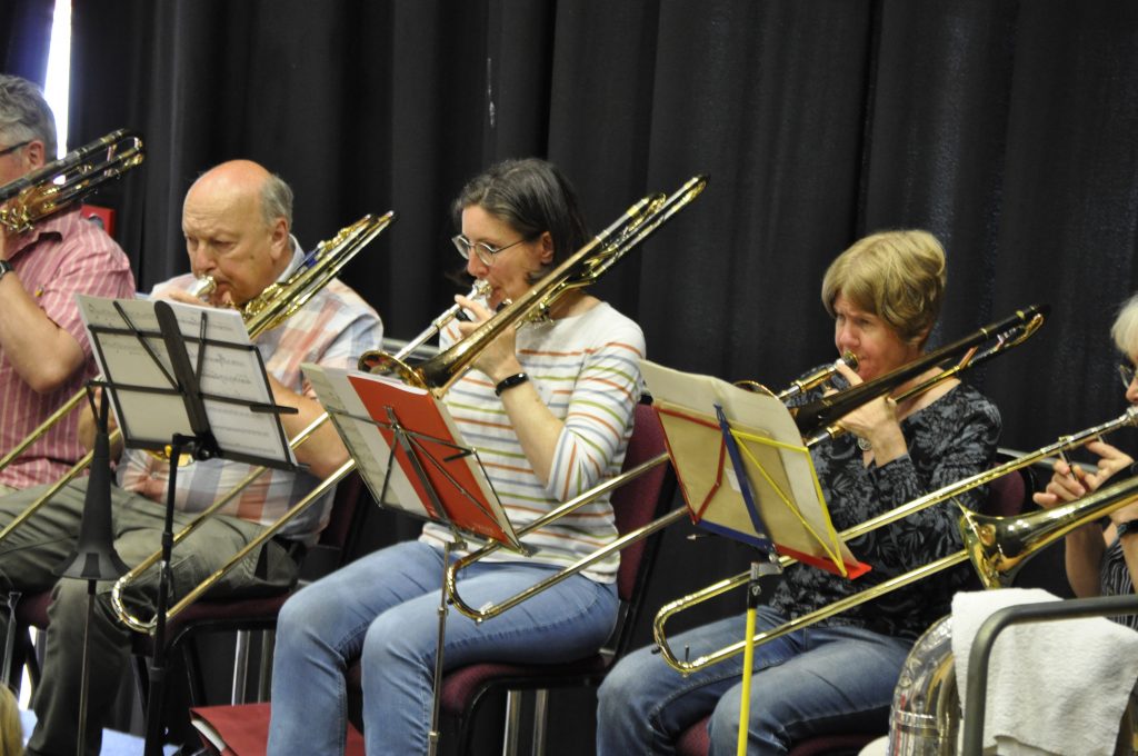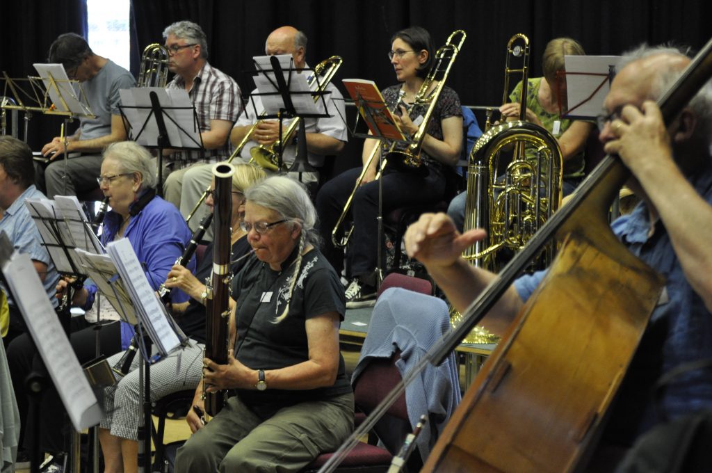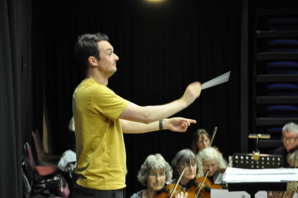 The orchestra, conducted by Rob Hodge, got underway with a warm-up involving a lot of standing up and sitting down to get the hearts pumping, then it was into the rousing 633 Squadron for the first rehearsal of the day.