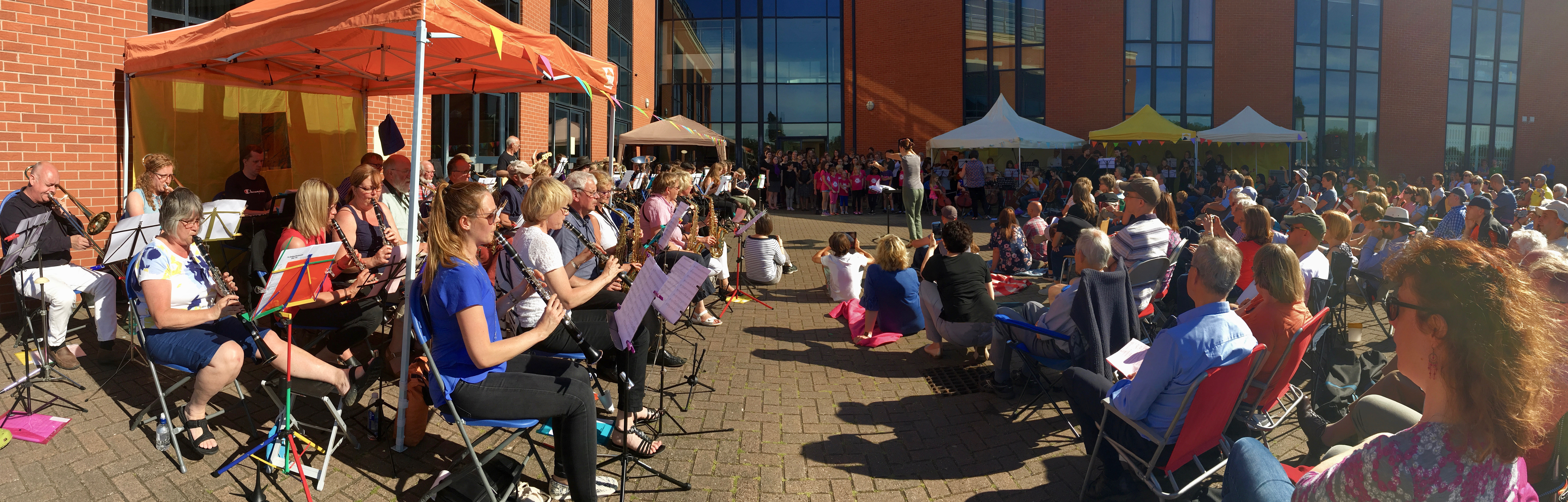 Rounding off the splendid 2017/18 MfE season was a Festival of Summer Music. Groups of all ages took part: Nottingham Youth Band, East Midlands Youth Windband, Girls Voices, Young Voices, Nottingham Youth Voices, Stictly Strings, East Midlands Youth String Orchestra, Adult Flute Choir and Swing Band.  (Apologies if I’ve missed anyone!) There was a relaxed atmosphere and the audience enjoyed stawberries and cream while the music played on. Spot the clothes pegs securing music to stands! It was a windy day, but the challenge of hanging on to the copies added to the fun.